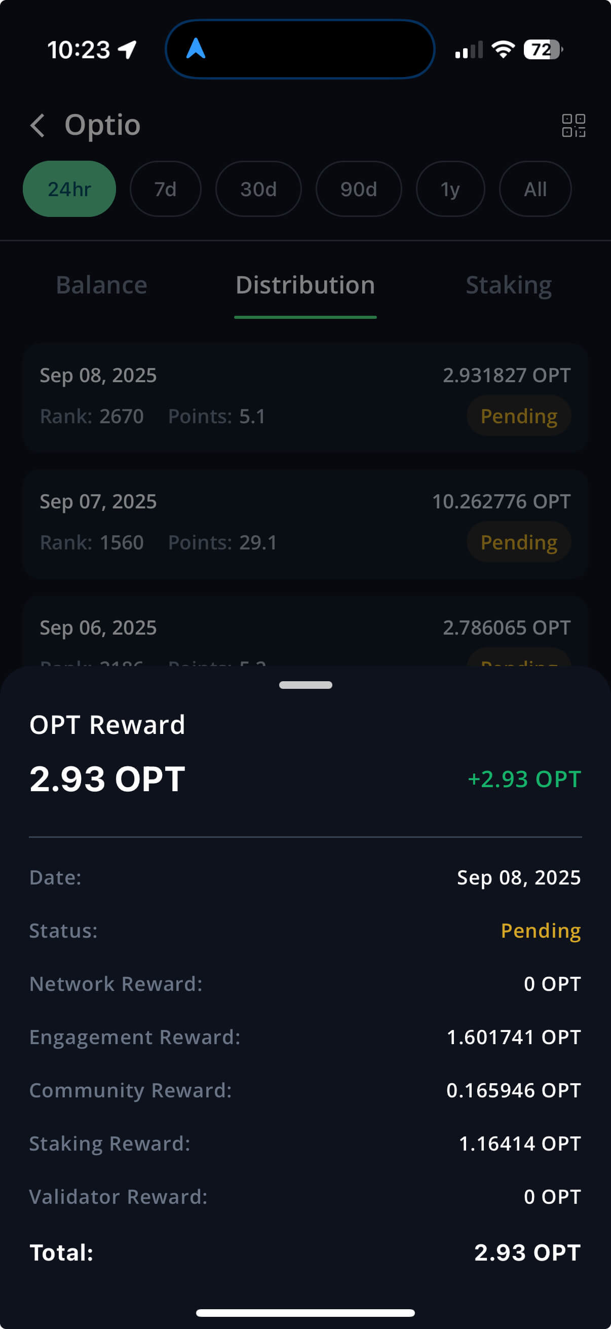 Node owners can now see exactly where their OPT rewards come from — whether it’s network, engagement, community, staking, or validator activity. Each reward summary displays the full breakdown alongside the total earned.